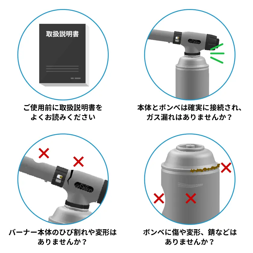 - ガスバーナー本体にひび割れや変形がないか十分に確認してください。