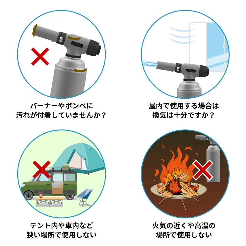 - 接続部や調整ノブ周り・充填式バーナーの場合は充填口からガス漏れがないか十分に確認してください。