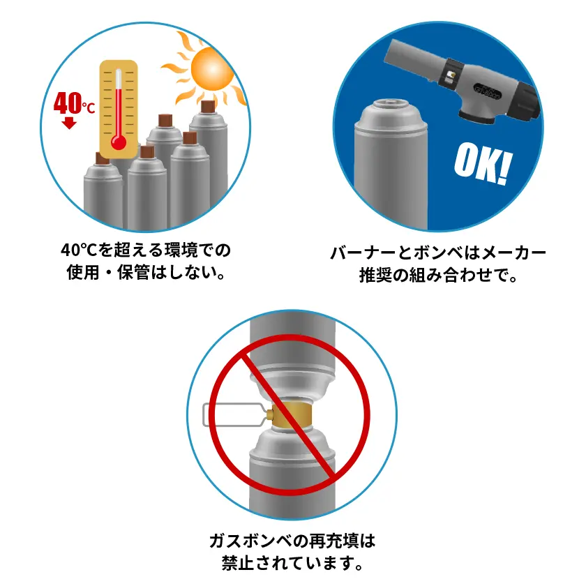 従いまして器具とガス(ボンベ)は同一ブランドもしくは、メーカー指定のブランドでご使用下さい。